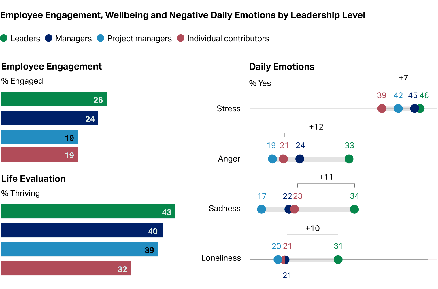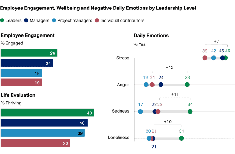 Najciekawsza obserwacja w tej części raportu dotyczy paradoksu liderskiego. Liderzy mają wyższe zaangażowanie (26%) i wyższy wskaźnik thriving (43%) niż indywidualni współpracownicy, ale jednocześnie o 7 punktów częściej zgłaszają stres, o 12 punktów częściej gniew, o 11 punktów więcej smutku i o 10 punktów więcej samotności w poprzednim dniu. Przywództwo daje większą sprawczość i status, ale wiąże się z dystansem społecznym i odpowiedzialnością za bolesne decyzje, które dotykają wielu osób.