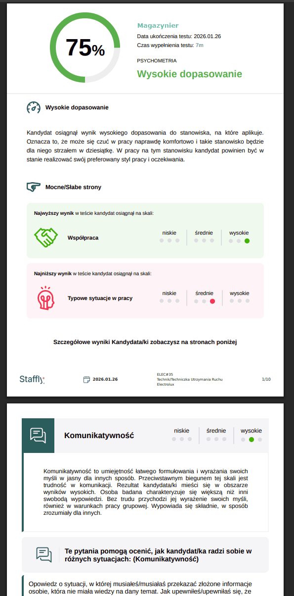 W procesach masowych i wolumenowych Staffly skraca czas potrzebny na wstępne filtrowanie kandydatów, a w rekrutacjach specjalistycznych daje dodatkowy sygnał jakościowy do porównania kandydatów między sobą.