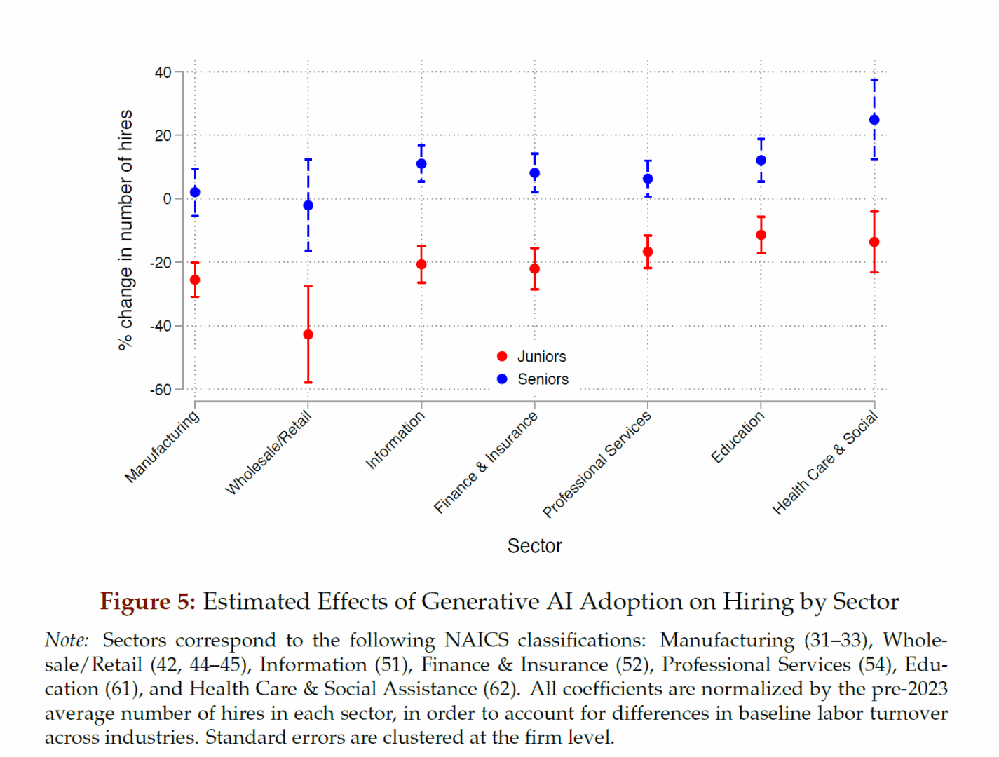 Wykres z raportu (Figure 5, str. 21) przedstawia, jak różne branże reagują na wdrożenie generatywnej AI. Największy spadek zatrudnienia juniorów odnotowano w sektorze wholesale i retail trade – aż o 40%.