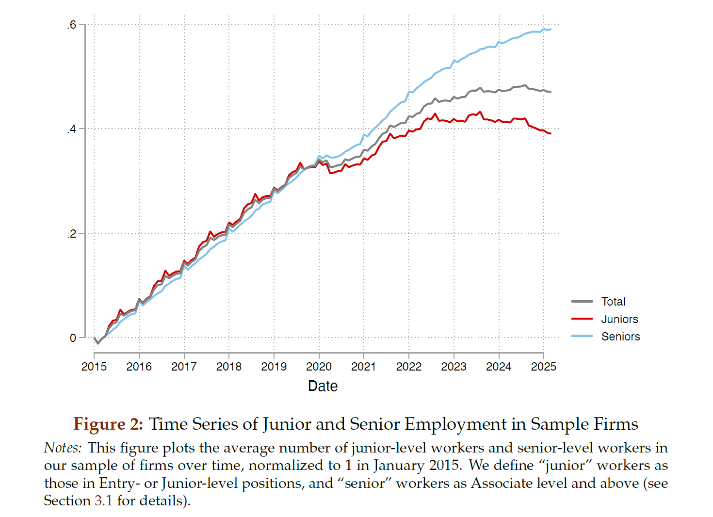 Wykres na stronie 15 raportu (Figure 2) pokazuje przełomowy moment: od połowy 2022 roku zatrudnienie juniorów przestaje rosnąć, a w 2023 roku zaczyna spadać, mimo że liczba seniorów w firmach stale się zwiększa. Badacze potwierdzają, że w firmach, które wdrożyły generatywną AI, liczba juniorów spadła średnio o 7,7% w ciągu sześciu kwartałów, podczas gdy liczba seniorów nadal rosła.